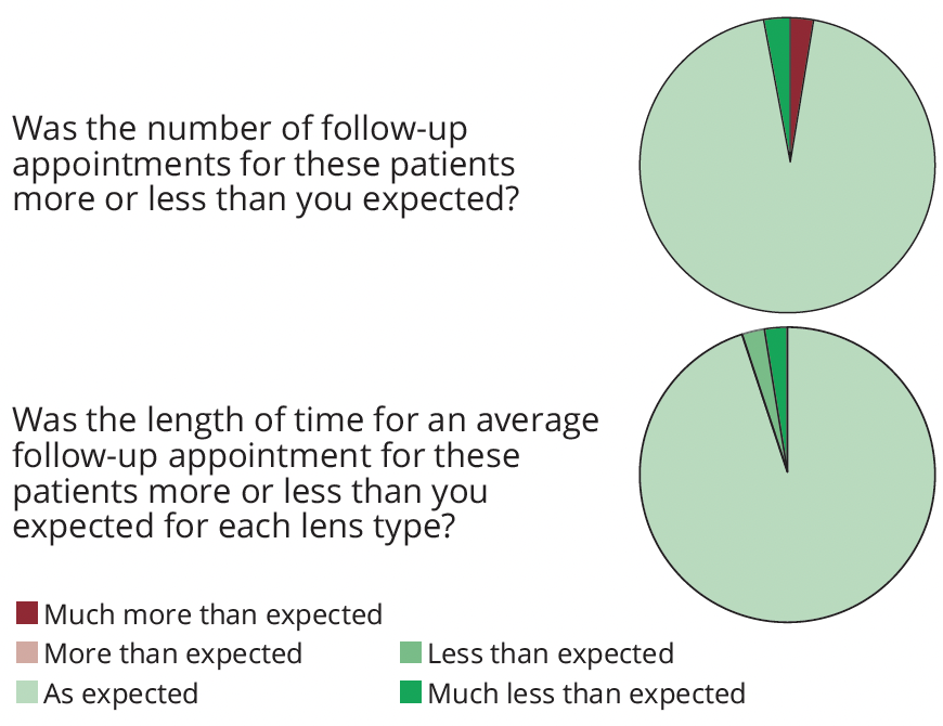 The majority of surgeons reported that the pre-operative and post-operative time requirements took the expected length of time for PCIOL patients, and 85% reported that PCIOLs did not take longer during the cataract surgical procedures than a standard monofocal IOL.